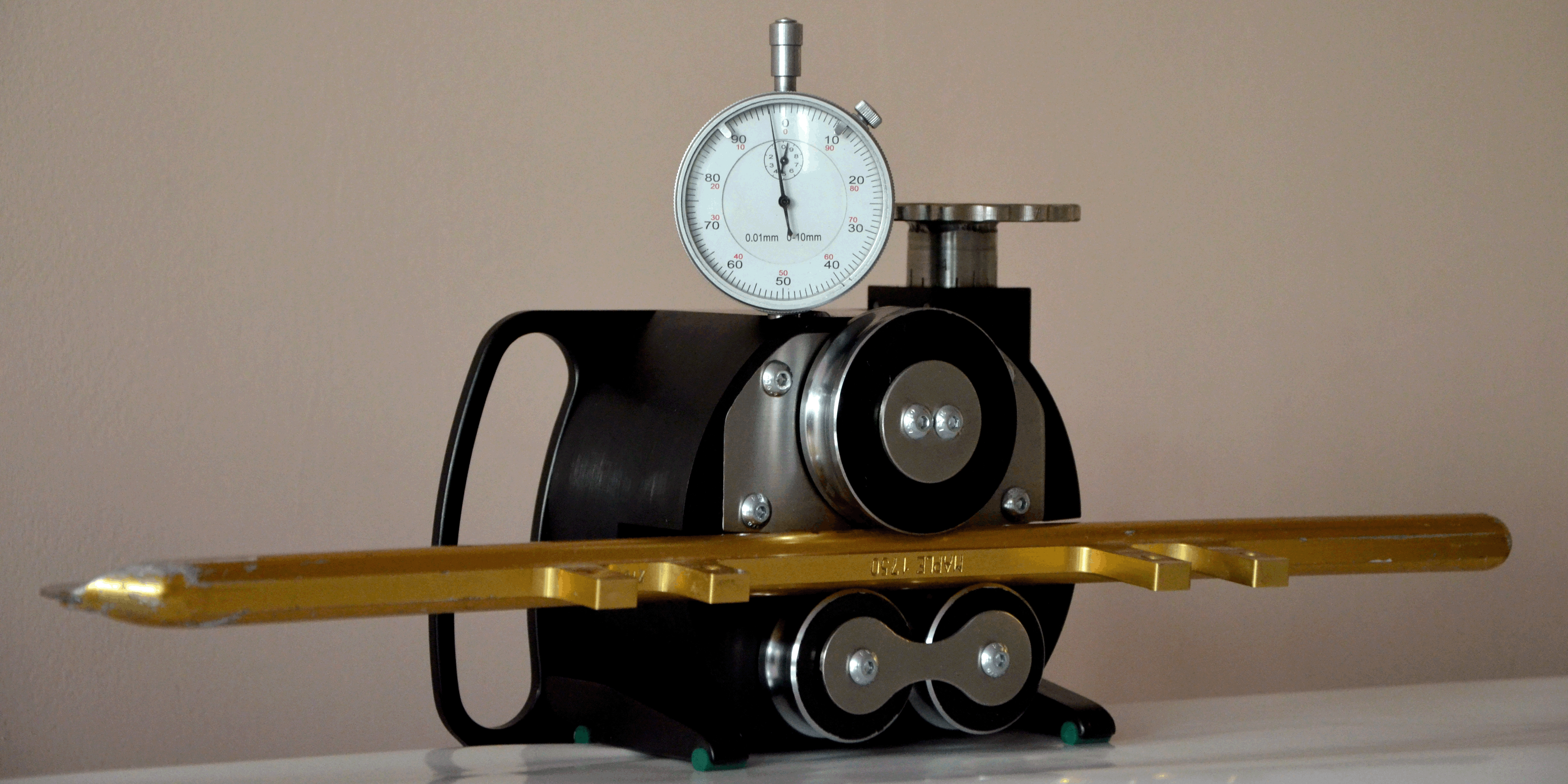 Radius gauge, dzięki zastosowanym magnesom, ''przykleja'' się do łyżwy, co sprawia, że pomiar jest stabilny oraz dokładniejszy. Układem wskazującym jest precyzyjny czujnik renomowanej szwedzkiej firmy LIMIT, dodatkowo posiadający podziałkę promieniową R[m]. Konstrukcja i pasek antypoślizgowy sprawiają, że urządzenie wygodnie i pewnie trzyma się w ręce. Wszystkie wałeczki, jak i końcówka pomiarowa, wykonane są z węglików spiekanych.